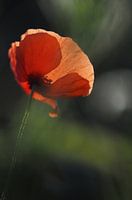 Klaproos in het tegenlicht. De stampers schijnen door het tegenlicht mooi door het blad. Door de donkere achtergrond springt de klaproos eruit.