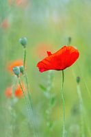 Door één bloem scherp in beeld te brengen blijft het geheel een rustig geheel.
