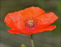 Helemaal open bloeiende klaproos in prachtig oranje-rode tinten.