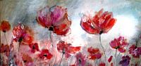 Bloemenschilderij met klaprozen in acrylverf en grafische elementen. Een kleurrijk en expressief bloemenschilderij voor in de woonkamer. Het straalt optimisme en vrolijkheid uit. De schoonheid van de natuur is altijd een onuitputtelijke bron van inspiratie. Bloemenfantasieën zijn kunstig geënsceneerd. Perfect voor een liefhebber van romantiek.