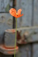 Alleenstaande rode klaproos voor de oude schuur. Het roestige scharnier van de deur en het oude hout zijn als achtergrond gebruikt.