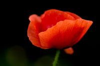 Een klaproos. De typische rode kleur komt optimaal tot zijn recht tegen de donkere achtergrond.