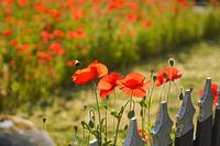Rode klaprozen bij een hek in het oude centrum van Noordwijk. De zon die er doorheen schijnt en het bewegen op de wind. Blijft magisch mooi dit.