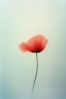 Dit minimalistische, fotorealistische schilderij toont een enkele klaproos met een tere, doorschijnende rode bloemkroon en een dunne, harige steel die zich elegant naar boven buigt. De achtergrond is zacht en dromerig, met subtiele tinten van wit en pastelgroen die een gevoel van rust en oneindigheid oproepen. De delicate details van de bloembladen, die lijken te vervagen aan de randen, versterken de fragiele schoonheid en vergankelijkheid van de bloem. De compositie straalt eenvoud, sereniteit en een bijna etherische sfeer uit, alsof de klaproos zweeft in een tijdloze ruimte.