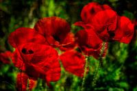 Papaver, ook wel klaproos of kollenbloem genoemd, tegen een groene achtergrond. Het felrood van de bloemen is versterkt door er een dubbelopname van te maken. Klaprozen zijn de bekendste rode bloemen die in het wild bloeien. Gelukkig zijn er steeds meer plekken waar deze vrolijke bloemen weer langs de korenvelden en andere akkers bloeien.