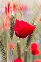 Rode klaprozen in een korenveld bij zonsondergang