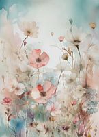 De delicate bloemblaadjes lijken te zweven op het canvas, elk penseelstreekje is doordrenkt met liefde en zorgvuldigheid. De kleuren variëren van zacht roze tot rood, en het vleugje blauw voegt een vleugje rust toe aan het tafereel. Deze aquareltechniek geeft de afbeelding een dromerige, bijna magische uitstraling. Het lijkt alsof de klaprozen rechtstreeks uit een betoverend sprookje zijn gesprongen.