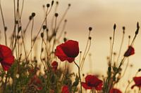 Foto van klaprozen tijdens de zonsondergang. Door de zonsondergang is de foto donker, maar de rode kleur van de klaprozen is nog steeds duidelijk zichtbaar. Een zeer warme, zomerse foto.