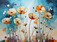 Een schilderij met klaprozen gehuld in blauwe tinten. De bloemen wiegen zachtjes op een denkbeeldige bries., De kleuren vervagen in elkaar, creëren een gevoel van sereniteit en nodigen de toeschouwer uit om te dwalen in de kalme schoonheid van het tafereel.