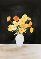 Aquarel schilderij van gele en oranje klaprozen in een witte vaas op een tafel, tegen een zwarte achtergrond, in een minimalistische stijl. Het schilderij heeft een eenvoudige compositie, met een beige papiertextuur, weinig details, geen schaduwen, laag contrast, zachte pastelkleuren en zachte, lage natuurlijke verlichting, waardoor het…