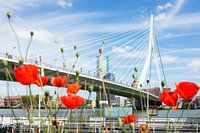 Mooie zomerse foto van Rotterdam, de Erasmusbrug met op de voorgrond rode klaprozen. De bloemen geven wat kleur aan de stad.