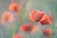 Foto gemaakt in een klaprozenveld. Alleen de voorste foto is scherp, de anderen op de achtergrond zijn wazig zodat je een mooie scherpte diepte en bokeh hebt. Het rood en groen contrasteert mooi.