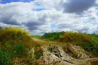 Zomers landschap met klaprozen en koolzaad. De rode en gele bloemen staan vol in bloei op een mooie zomerdag. Een klaproos is fel rood en typisch een bloem die groeit op verstoorde grond, zoals hier op een stuk zanderige bouwgrond in Rotterdam. Ook op de verstoorde grond van de Eerste Wereldoorlog groeiden deze bloemen, waardoor ze een symbool werden voor deze oorlog.