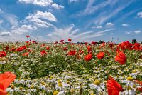 Een veld vol met rode klaprozen en kamille in Zeeland in Nederland.