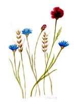 Deze aquarel laat delicate en zomerse korenbloemen, korenaren en papaverbloesems zien.