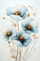 Een verfijnde botanische compositie van vier luchtige klaprozen in een sereen pastelblauw, omlijst door gouden accenten en sierlijke stengels. De bloemen zweven als een delicate aquarel tegen een lichte achtergrond, waarbij de zachte transparante bloemblaadjes een dromerige sfeer creëren die zowel modern als tijdloos aandoet.