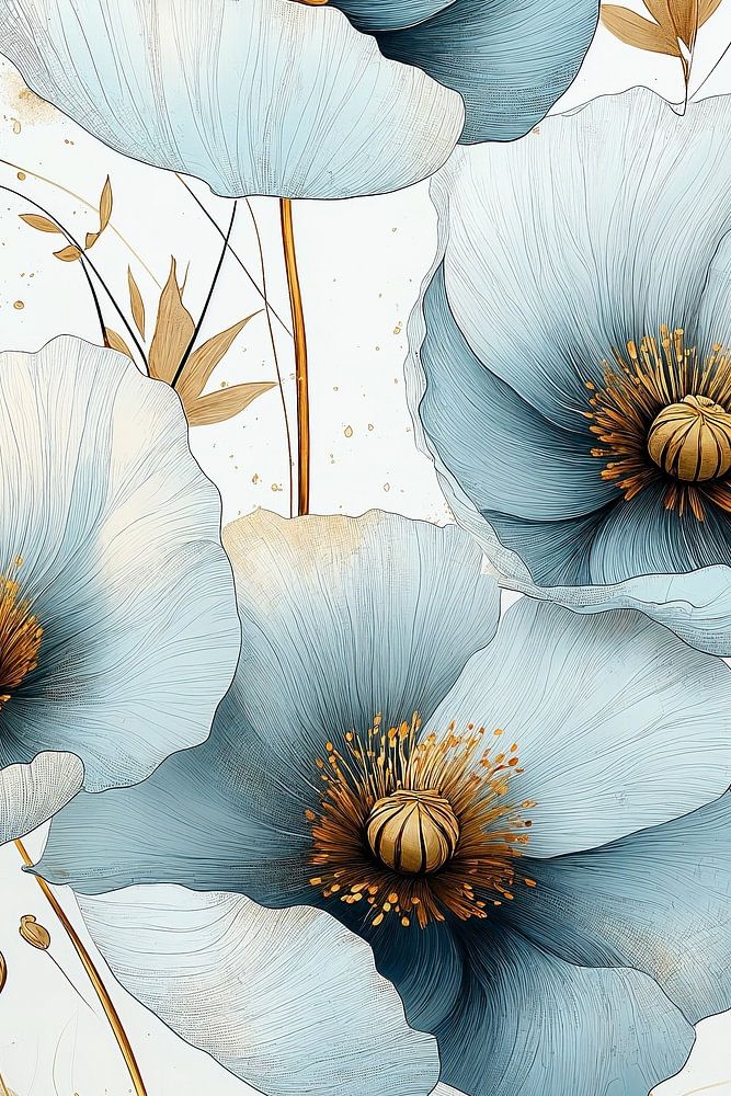 Een verfijnde botanische compositie van vier luchtige klaprozen in een sereen pastelblauw, omlijst door gouden accenten en sierlijke stengels. De bloemen zweven als een delicate aquarel tegen een lichte achtergrond, waarbij de zachte transparante bloemblaadjes een dromerige sfeer creëren die zowel modern als tijdloos aandoet.