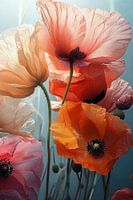 Dit kunstwerk onthult een betoverende compositie van klaprozen in verschillende stadia van bloei. De delicate, bijna doorschijnende petalen in warme tinten oranje, roze en wit contrasteren prachtig met de koele, blauwe achtergrond. Het zachte licht dat door de bloemblaadjes schijnt, creëert een etherische gloed die de kijker meeneemt…