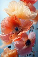 Dit kunstwerk toont een intiem portret van klaprozen in volle bloei, badend in zacht licht. De delicate, bijna doorschijnende blaadjes in warme tinten oranje, geel en roze contrasteren prachtig met de diepblauwe achtergrond. De close-up onthult de fijne details van de bloemen, van de tere nerven in de bladeren tot de donkere, bijna zwarte harten. Het spel van licht en schaduw accentueert de zachte textuur van de bloemblaadjes, waardoor ze bijna tastbaar lijken. De compositie straalt een serene, dromerige sfeer uit en nodigt de kijker uit om even stil te staan bij de vergankelijke schoonheid van de natuur. Dit beeld roept een gevoel van rust en verwondering op, en laat ons de subtiele nuances en de korstondige pracht van deze eenvoudige veldbloemen opnieuw waarderen.