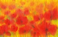 Klaprozen in de avondzon is een handgeschilderd aquarel schilderij in landschapsformaat van de kunstenaar Karen Kaspar. In het gouden licht van de ondergaande zon gloeien talloze klaprozen in levendige roodtinten. De stralen van de ondergaande zon baden het klaprozenveld in een warm gouden licht.