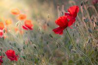 De laatste zonnestralen van de dag vallen over deze prachtige klaprozen. Een warme en romantische sfeer.
