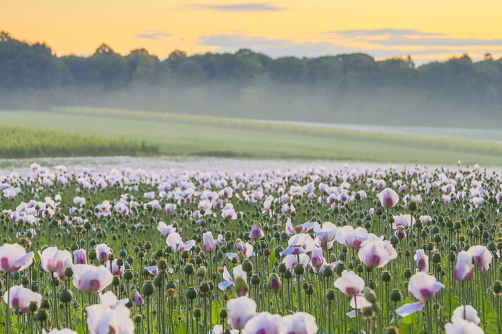 Een veld vol met roze klaprozen in het vroege ochtendlicht. Speciaal vroeg opgestaan om dit mooie licht te kunnen "pakken".