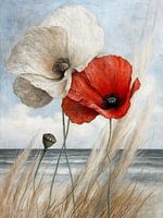 Op een rustig stukje kust, waar de golven zachtjes het zand raken en het gras zachtjes wiegt in de wind, rijzen twee klaprozen in al hun pracht op. De rode bloem weerspiegelt de passie en energie van de zee, terwijl de witte bloem ernaast staat als een symbool van zuiverheid en sereniteit. Hier vertelt de natuur een duidelijk verhaal…