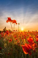 Prachtige avondsfeer midden in de natuur. Groot klaprozenveld tijdens een betoverende zonsondergang.