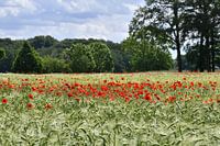 Meestal is een veld met aren groen zo ver het oog reikt. Nu even niet. Klaprozen geven kleur en accent aan een overwegend groene omgeving.