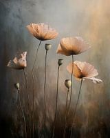 De papavers staan slank en kwetsbaar in het zachte licht, alsof ze zich er voorzichtig aan toevertrouwen. Hun tere bloemblaadjes zijn dun als zijde en laten het licht door, waardoor warme tinten van perzik, honing en zacht goud ontstaan. Het licht lijkt niet alleen op de bloemen te vallen, maar erdoorheen te ademen, waardoor elke nerf…