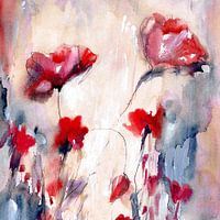 Een kleurrijke bloemenfoto met klaprozen voor in de woonkamer. Het straalt optimisme en vrolijkheid uit. De schoonheid van de natuur is altijd een onuitputtelijke bron van inspiratie. Bloemen, bloesems, bladeren....Waterverfschilderij met klaprozen in rijke grijs- en roodtinten.