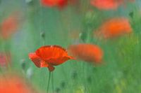 Door één klaproos scherp te fotograferen in een verder vage foto, springt deze bloem eruit. Alle vage rode vlekjes in de achtergrond suggereren een veld vol, zonder dat ze de aandacht opeisen en het een rommelig geheel wordt.