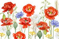 Klaprozen, korenbloemen, boterbloemen en grassen in het veld gemaakt in aquarel en digitaal bewerkt.