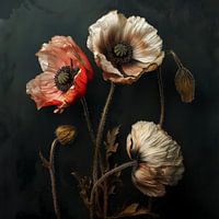 Het contrast tussen de vergane klaprozen en de gestructureerde, etherische donkere achtergrond versterkt het dramatische effect van het tafereel. De donkere achtergrond, doordrenkt met een mysterieuze diepte, laat de subtiele details van de klaprozen op een bijna magische wijze naar voren komen. Het geheel roept een gevoel van weemoed op, waarbij de vergankelijkheid van het leven wordt geaccentueerd door de prachtige doch kwetsbare bloemen, die dansen op de rand van herinnering en vergetelheid.