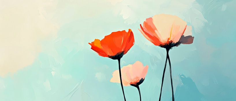 Delicate klaprozen in zachte kleurtinten dansen zachtjes in het licht, omringd door een rustgevende hemel. Hun levendige bloemblaadjes trekken de aandacht en voegen een vleugje natuur toe aan elke kamer. Perfect voor de woonkamer, waar de levendige energie de kamer verwarmt en een uitnodigende sfeer creëert.