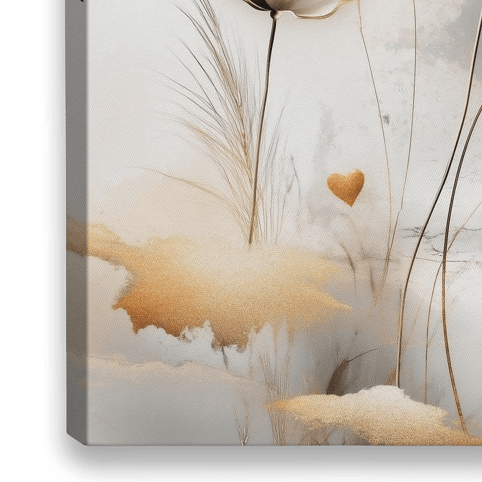 Twee elegante klaprozen met delicate bloemblaadjes stijgen op in de lucht. Omringd door zwevende gouden harten en delicate grassen, ontvouwt zich een vredige en zachte sfeer. Het subtiele kleurenpalet, gedomineerd door wit, crème en delicate goudtinten,…