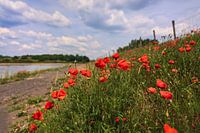 Een lucht met mooie stapelwolken, een rivier ( De IJssel) en een dijk met rode klaprozen. Een Hollands landschap. De foto is gemaakt in Doesburg (Achterhoek, Gelderland).