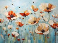 Schilderij van rode klaprozen op een aquablauwe achtergrond. Fine art meets paletmes. Mooie contrasterende kleurstelling. Passend bij diverse stijlen en trends.