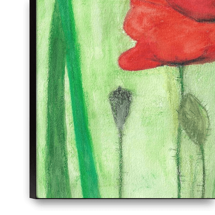 Deze aquarel toont delicate rode klaprozen tegen een groene achtergrond die de rode tinten bijzonder goed naar voren brengt.