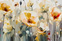 Klaprozen in een weiland in de zomer, een abstracte bloemencompositie met klaprozen op een klaprozenveld in pasteltinten.