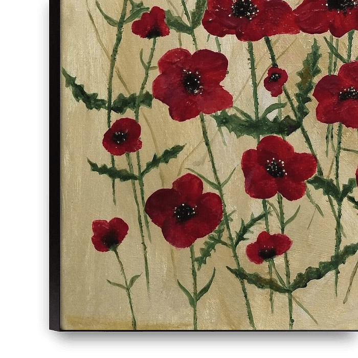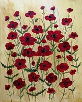 Dit acrylschilderij toont veel klaproosbloesems in prachtige rode tinten. Een veld vol zomerse frisheid.