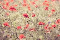 In alle vroegte in het veld liggen om de klaprozen en andere wilde bloemen te fotograferen op een warme zomerdag.
