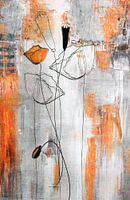 Abstracte kunst,klaprozen in oranje met grijze tinten,mixed media met verf,papier en lijntekening