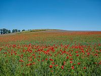 Klaprozenveld bloeit op het platteland in de zomer