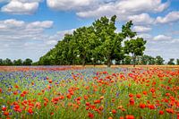 De helderrode bloemen van de klaproos, die in Midden-Europa in het wild voorkomt, bloeien vanaf eind mei en markeren het begin van de vroege zomer. Klassiek landschapsgezicht met korenbloemen.