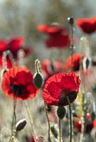 Aan het eind van de lente staan alle klaprozen in bloei. In de vroege ochtend schittert de dauw, wat zorgt voor een fris beeld.