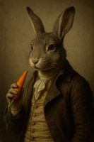 Een konijn in aristocratische kledij poseert statig met een wortel in de hand, alsof hij zo uit een historisch olieverfportret is gestapt. Dit speelse en verfijnde kunstwerk combineert humor met klassieke charme en barst van karakter.