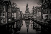 Klassiek gezicht op de Waag van Alkmaar met rechts de Oude stad, Zijdam. Foto gemaakt vanaf de Appelstaagbrug.