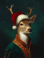 In dit kunstwerk zien we een hert dat statig en rustig in de lens kijkt. Het draagt een rode kerstmuts die meteen een feestelijke sfeer oproept. De ogen van het hert zijn zacht maar alert waardoor het portret een warme persoonlijkheid krijgt. De groene mantel met gouden patronen maakt het geheel luxueus en bijna koninklijk. De donkere…