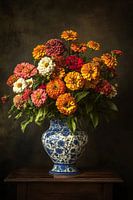 Dit prachtige ontwerp toont een weelderig boeket van kleurrijke zinnia’s in volle bloei, zorgvuldig geschikt in een klassieke blauwe en witte porseleinen vaas. De bloemen stralen in verschillende tinten oranje, geel, rood, roze en wit, wat een warm en vrolijk gevoel oproept. De groene bladeren omlijsten het geheel prachtig en geven een…
